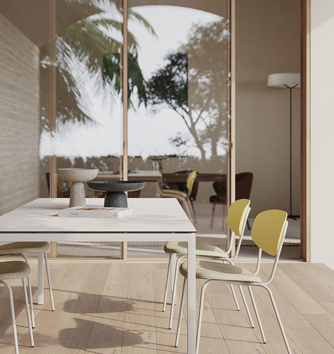 Das Design vereint Robustheit und Eleganz und bietet eine solide Edelstahlstruktur, die effizientes Stapeln ermöglicht – eine praktische und vielseitige Lösung. Die organische und ergonomische Ästhetik verleiht dem Stuhl eine eigenständige Persönlichkeit und ermöglicht gleichzeitig eine einfache Integration in verschiedene Räume: Terrassen, Gärten, Essbereiche, Büros oder Contract-Projekte. Die zahlreichen Konfigurationsmöglichkeiten und die breite Farbpalette erlauben es, jedes Stück individuell an die Anforderungen des Projekts anzupassen, während die Kombination aus Stärke, Funktionalität und raffiniertem Design seinen Wert als Möbel für das zeitgenössische Leben unterstreicht.