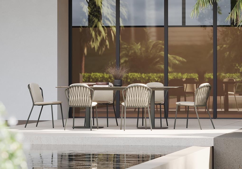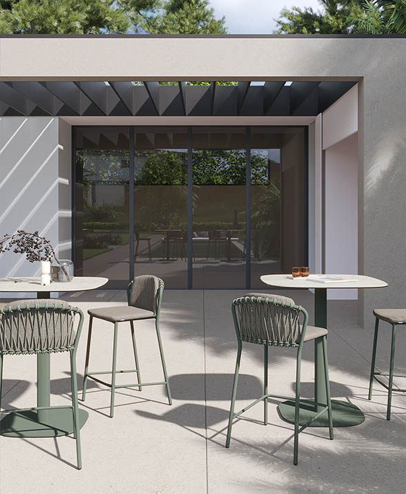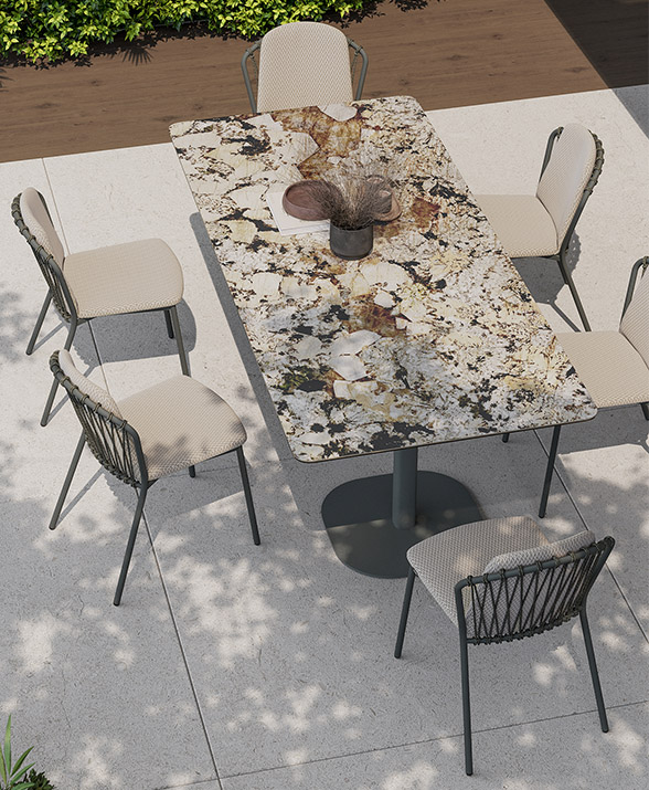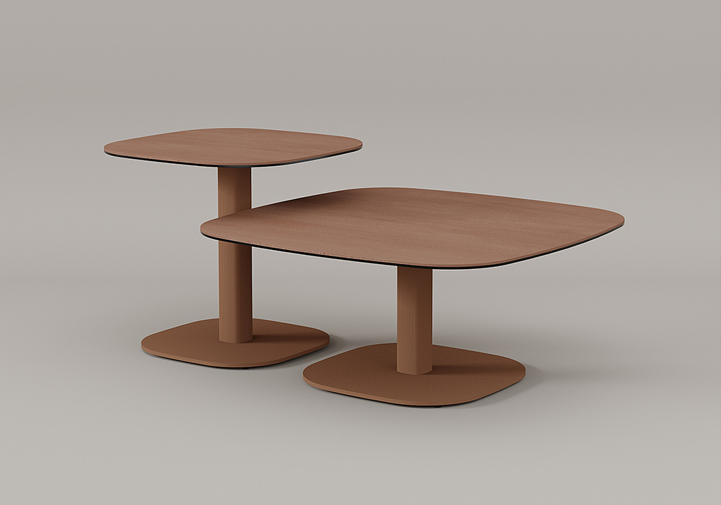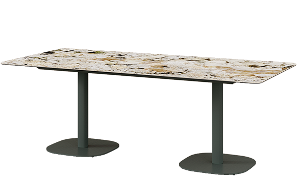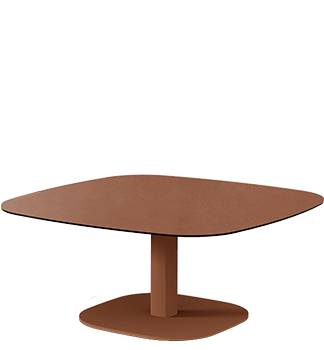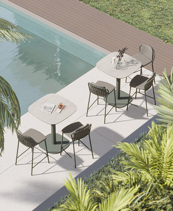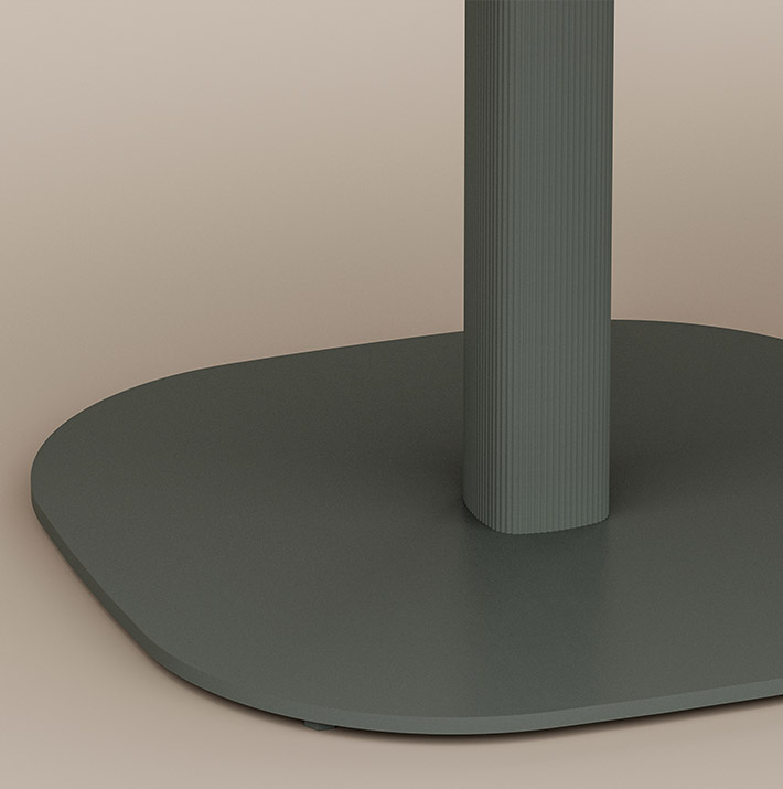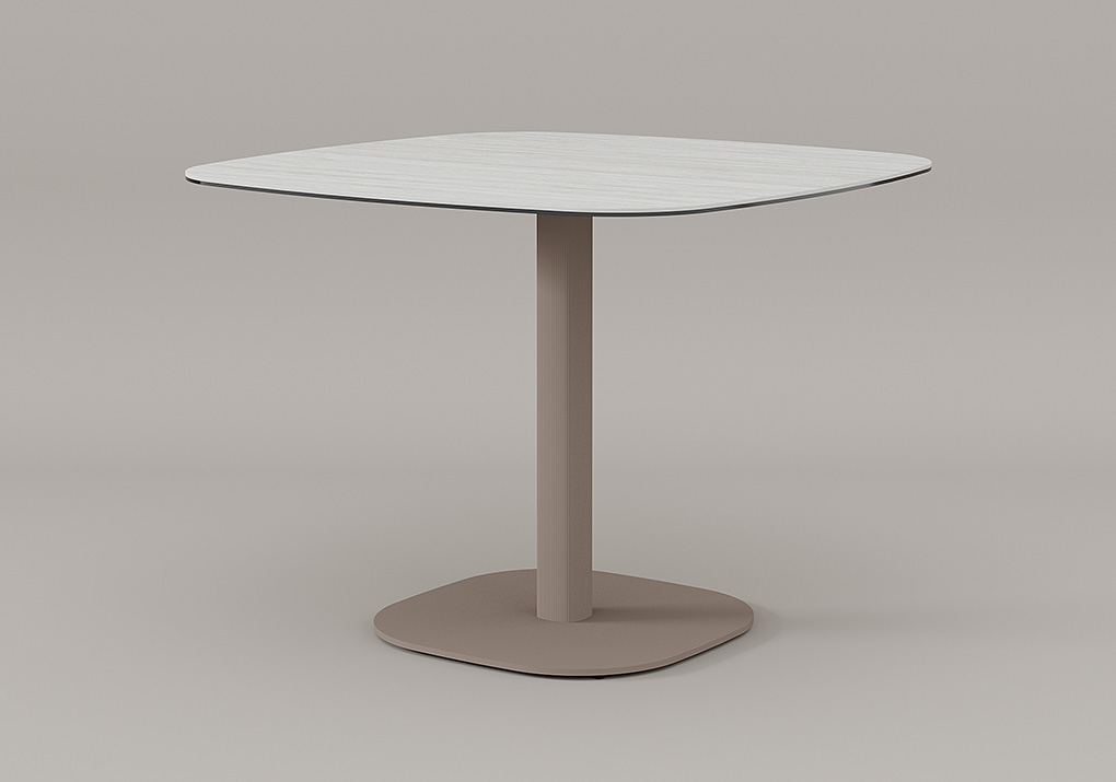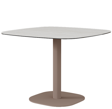 Tables et tables basses à pied central (simple ou double) avec plateau céramique laminé sur un support verre, disponibles en sept hauteurs différentes (H33 / H40 / H55 / H66 / H75 / H90 / H110). Tous les éléments extérieurs métalliques de sa structure ont été fabriqués en acier inoxydable et en aluminium. Base (45×45, 50×50, 55×55, 60×60 cm) en acier inoxydable. Tube strié en aluminium extrudé de 7,8×7,8 cm.
